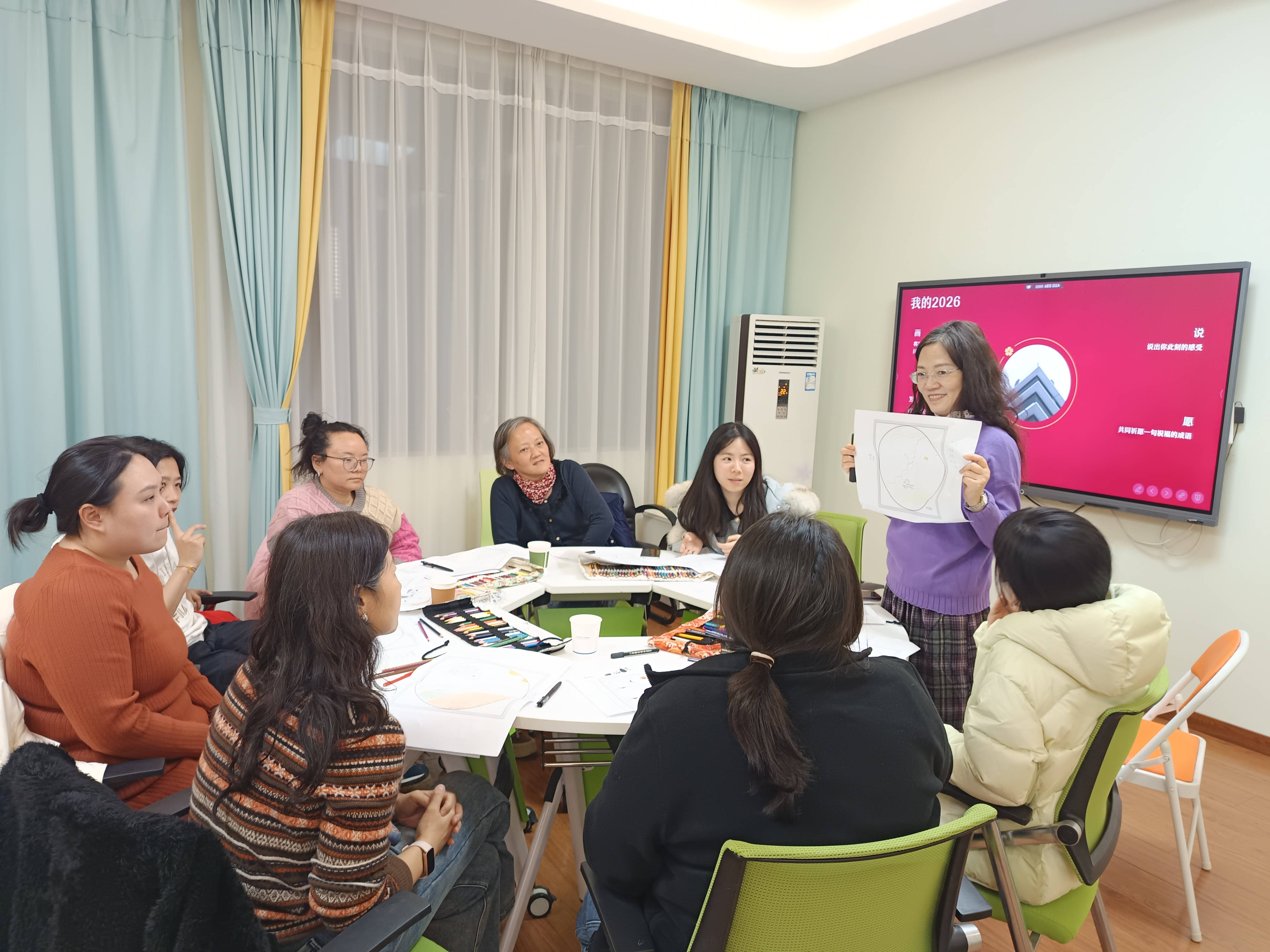 帶著對過去的梳理與整合,畫筆移至圓紙右側(cè)。老師引導(dǎo)大家描繪希望在2026年發(fā)生、或已在2025年萌芽的美好畫面。畫畢,大家用“滿足”“欣慰”“平靜”“喜悅”“激動”等積極的情緒詞匯為自己的畫作命名并寫下感受。在隨后的“壓力故事與支持需求”分享中,大家交流了壓力來源,表達了對“空間”“自我穩(wěn)定”“獨處”“被理解”等不同形式支持的渴望。無論是通過自我成長還是從關(guān)系中汲取養(yǎng)分,每個人都在努力構(gòu)建自己的心理韌性,這份共同的努力令人感動。